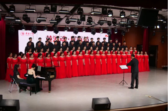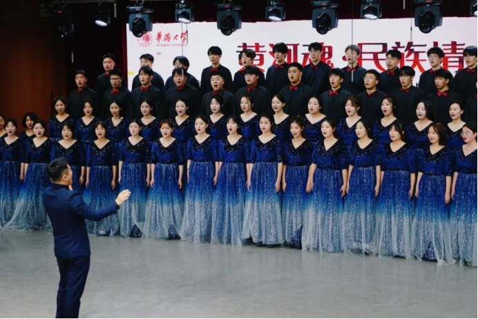 音乐会分为上下两篇章,以“文化共融”与“抗战精神”为主线,精选16首经典作品。上半场以南宋豪放词人辛弃疾的《破阵子》开篇,随后展现原南北朝乐府诗《敕勒歌》的苍茫辽阔、台湾民谣《丢丢铜仔》的活泼灵动、沂蒙山抗日根据地军民动人故事的《爱永在》等优秀曲目依次上演,通过混声合唱、男女声小合唱等形式,展现了中华文化多元一体的深厚底蕴。下半场聚焦抗战主题,完整呈现冼星海的不朽巨著《黄河大合唱》,其中配乐诗朗诵《黄河之水天上来》则以磅礴语言艺术再现民族危亡时刻的呐喊,《黄河怨》的女高音独唱如泣如诉,《保卫黄河》的轮唱铿锵有力,最后的《怒吼吧,黄河》向全世界被压迫的人民发出战斗的警号将音乐会推向高潮。终场全体观众与演员齐唱《歌唱祖国》,激昂旋律响彻华园,彰显新时代青年的爱国担当。
